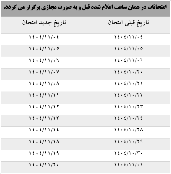 به اطلاع دانشجویان عزیز میرساند؛ حسب آخرین سیاست کلی اعلامی وزارت علوم و تصمیم کارگروه استانی آموزش عالی استان مازندران مورخ 1404/11/30 امتحانات پایان ترم نیم سال اول تحصیلی 1405- 1404 دانشگاه تخصصی فناوریهای نوین آمل به صورت مجازی و مطابق تقویم دانشگاهی برگزار می گردد: